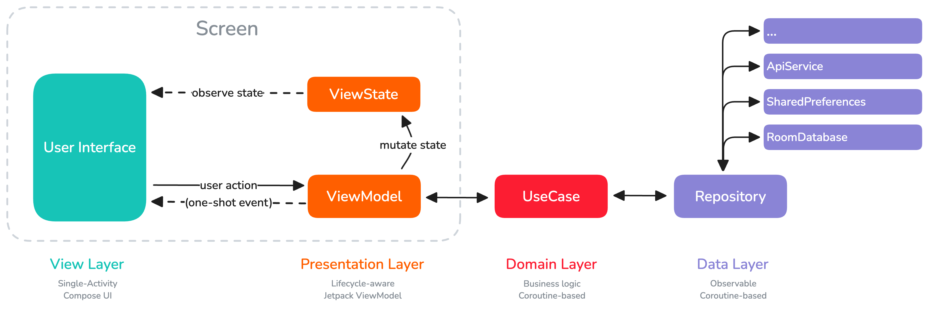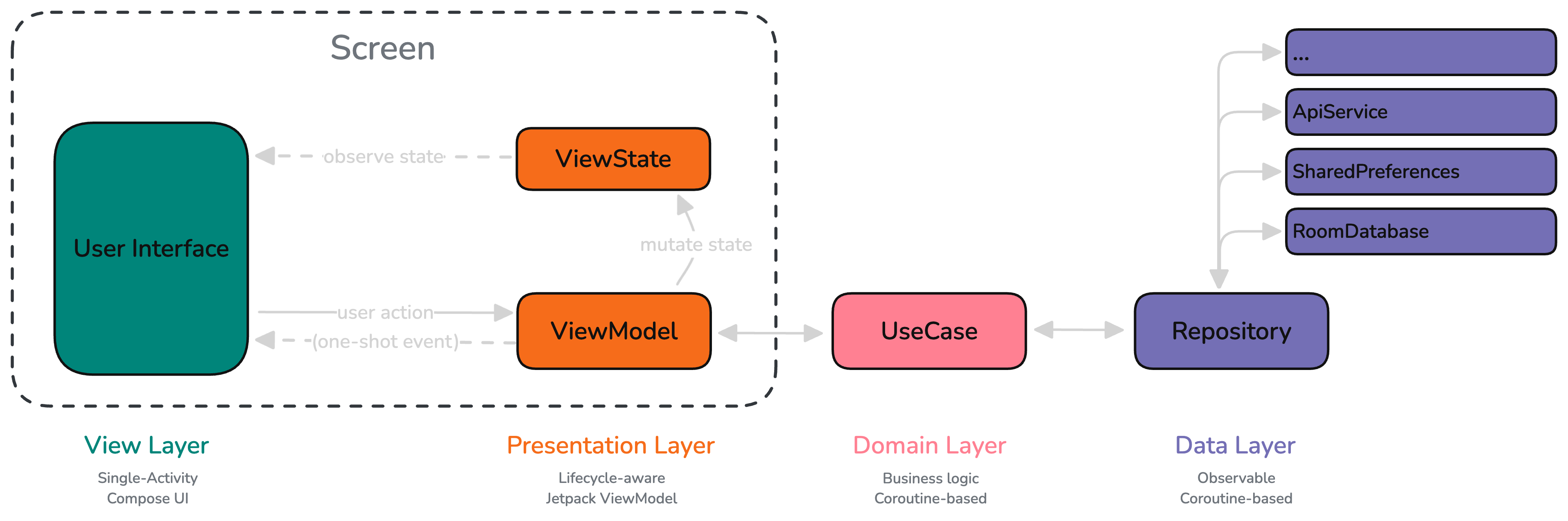 At the presentation layer, we follow the MVVM design pattern, where each screen has its own ViewModel that holds the screen state and contains presentation logic. We adhere to the Unidirectional Data Flow pattern, where user actions from the UI are processed by the ViewModel, which then mutates the screen state. This screen state is then reflected back to the UI. The app uses standard Lifecycle components from androidx set of libraries.