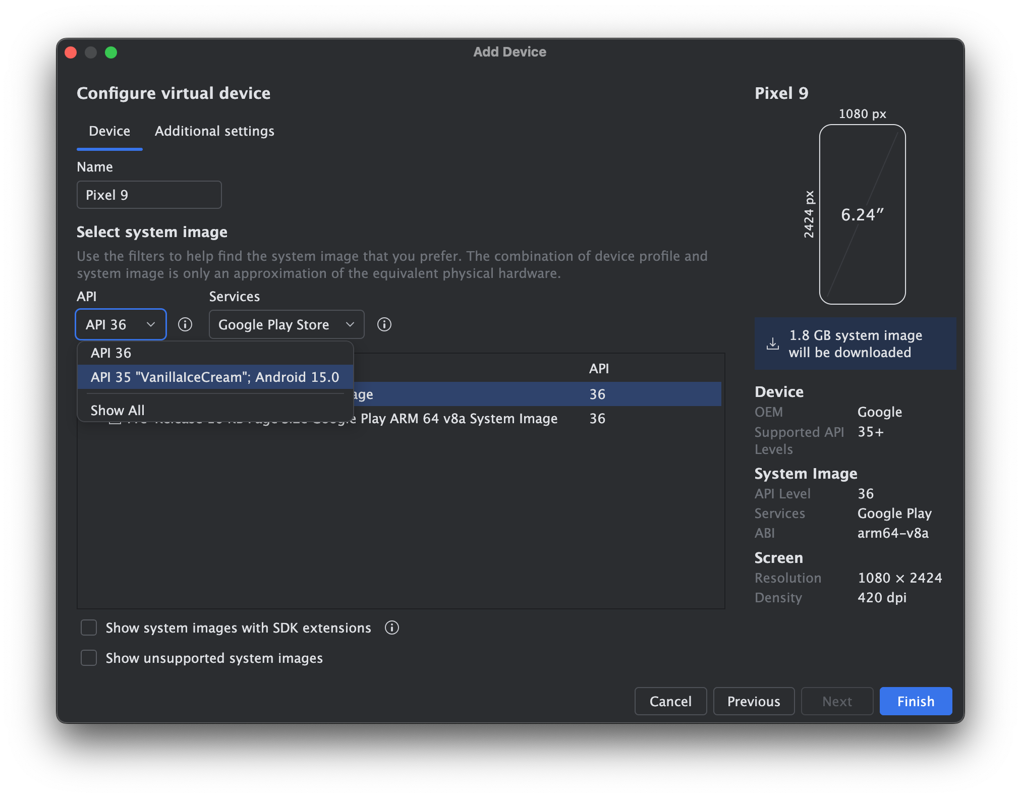 - Select a system image with an appropriate API level. For general purposes, use the latest stable version (e.g., API 35 — Android 15).