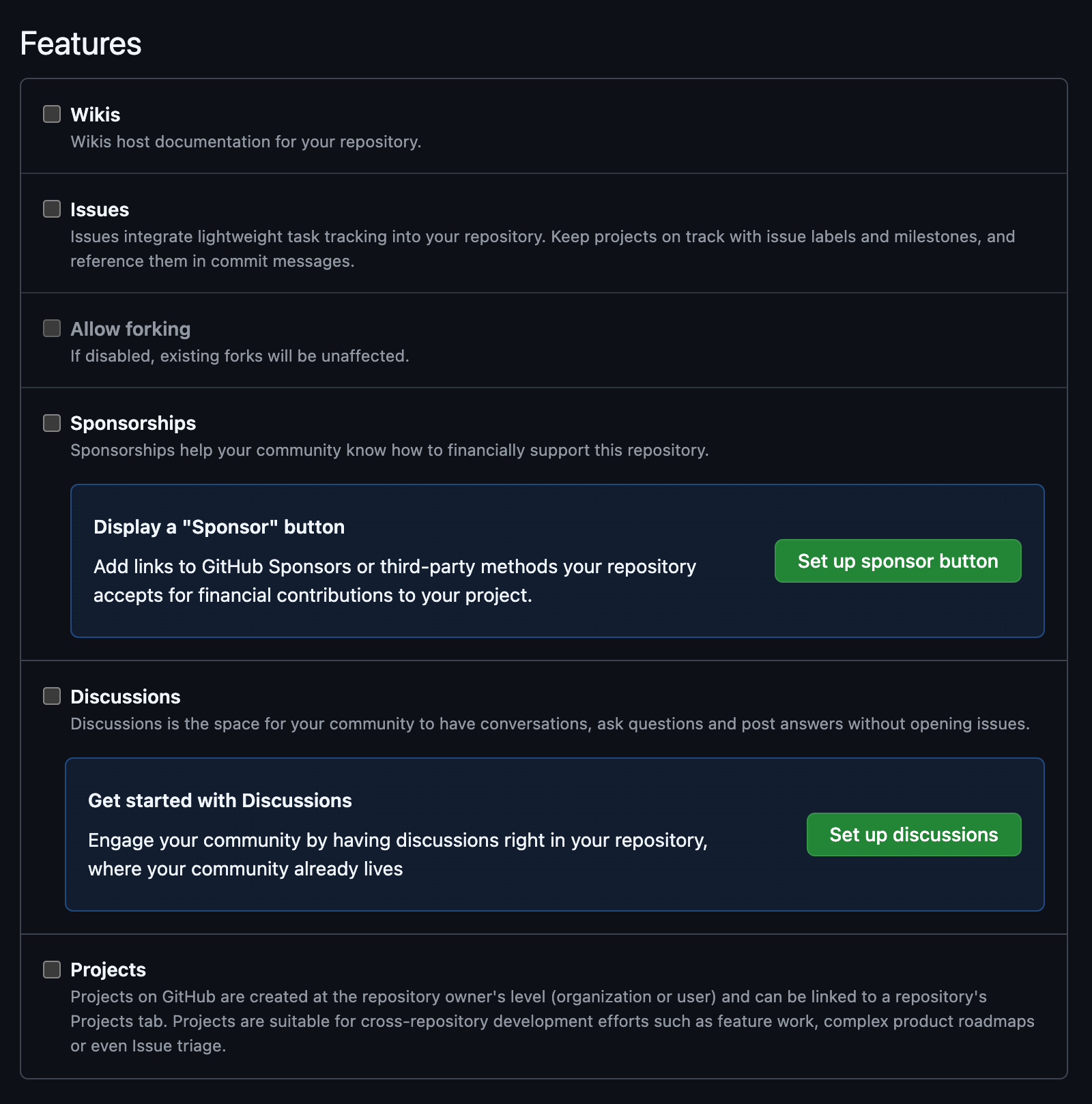Disable all features: Wikis, Issues, Sponsorships, Discussions and Projects.