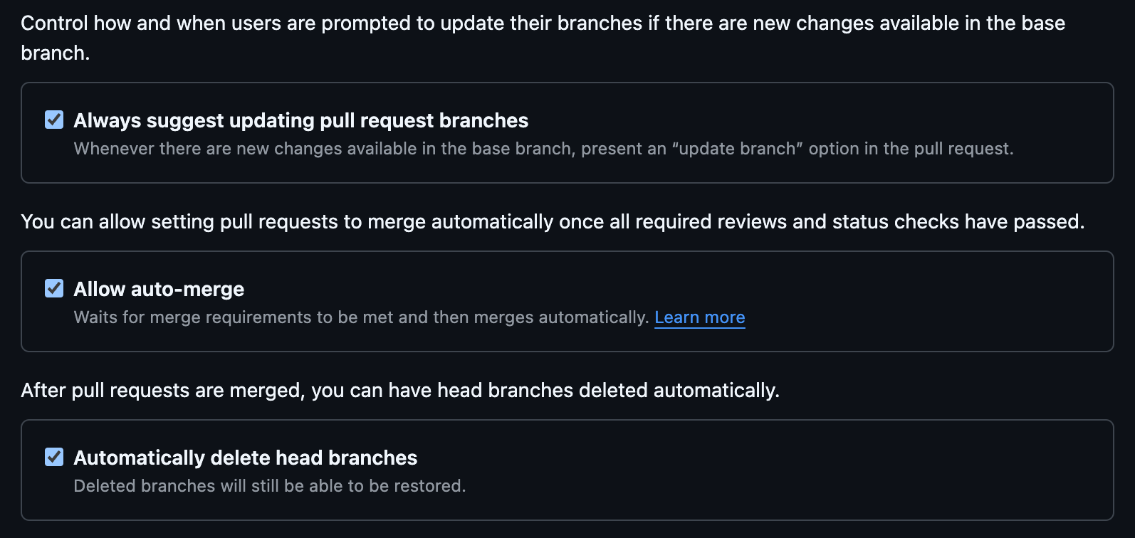 - Enable Automatically delete head branches so there is no need to delete branches manually after each PR merge.