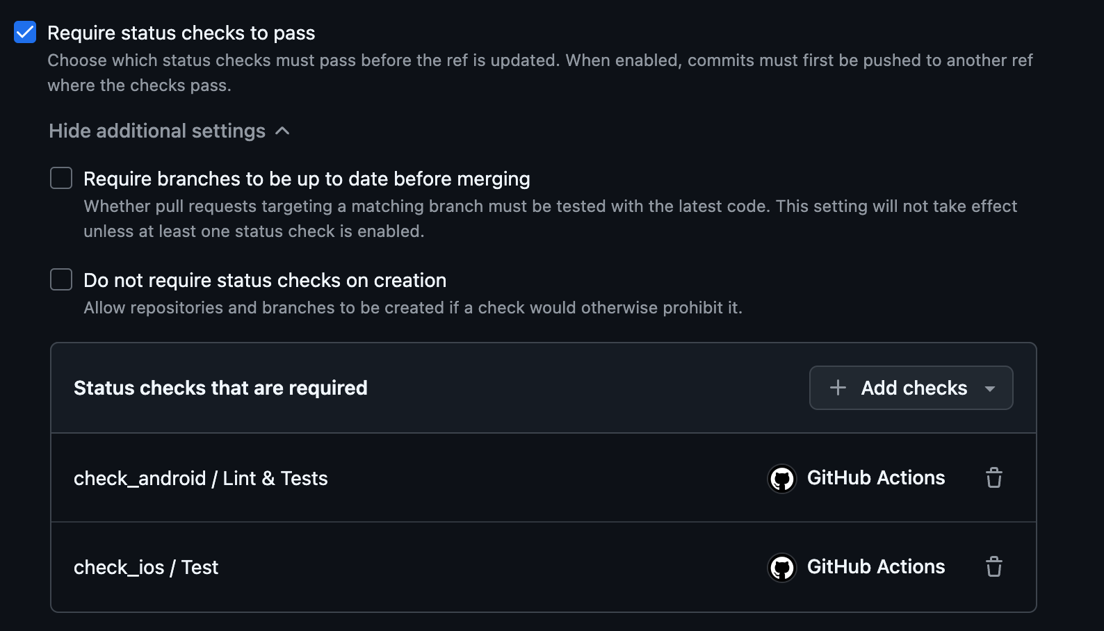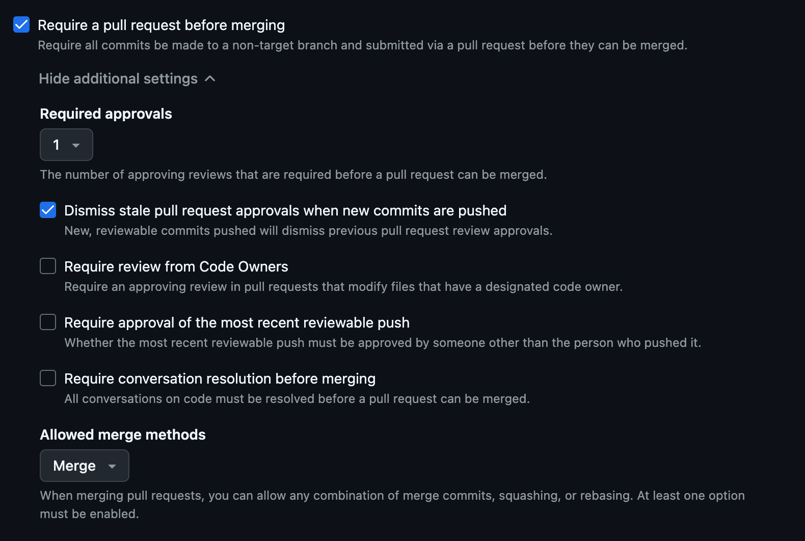 1or more (this might be project-specific). - Enable Dismiss stale pull request approvals when new commits are pushed (this might be project-specific).