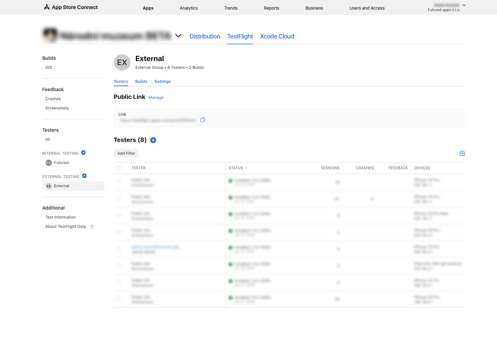 Beta builds are mainly used by our QA team. There's possibility to add beta build to external testing and share it via link or email invitation if needed (see attached screenshot). External beta build has to go through app review. It can take longer for the first build or after some longer period without uploading a new build but it's usually approved immediately. Always send tested builds to external testing!
