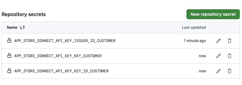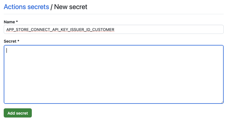 APP_STORE_CONNECT_API_KEY_ISSUER_ID_CUSTOMER=Issuer IDAPP_STORE_CONNECT_API_KEY_KEY_ID_CUSTOMER=KEY IDAPP_STORE_CONNECT_API_KEY_KEY_CUSTOMER= key content