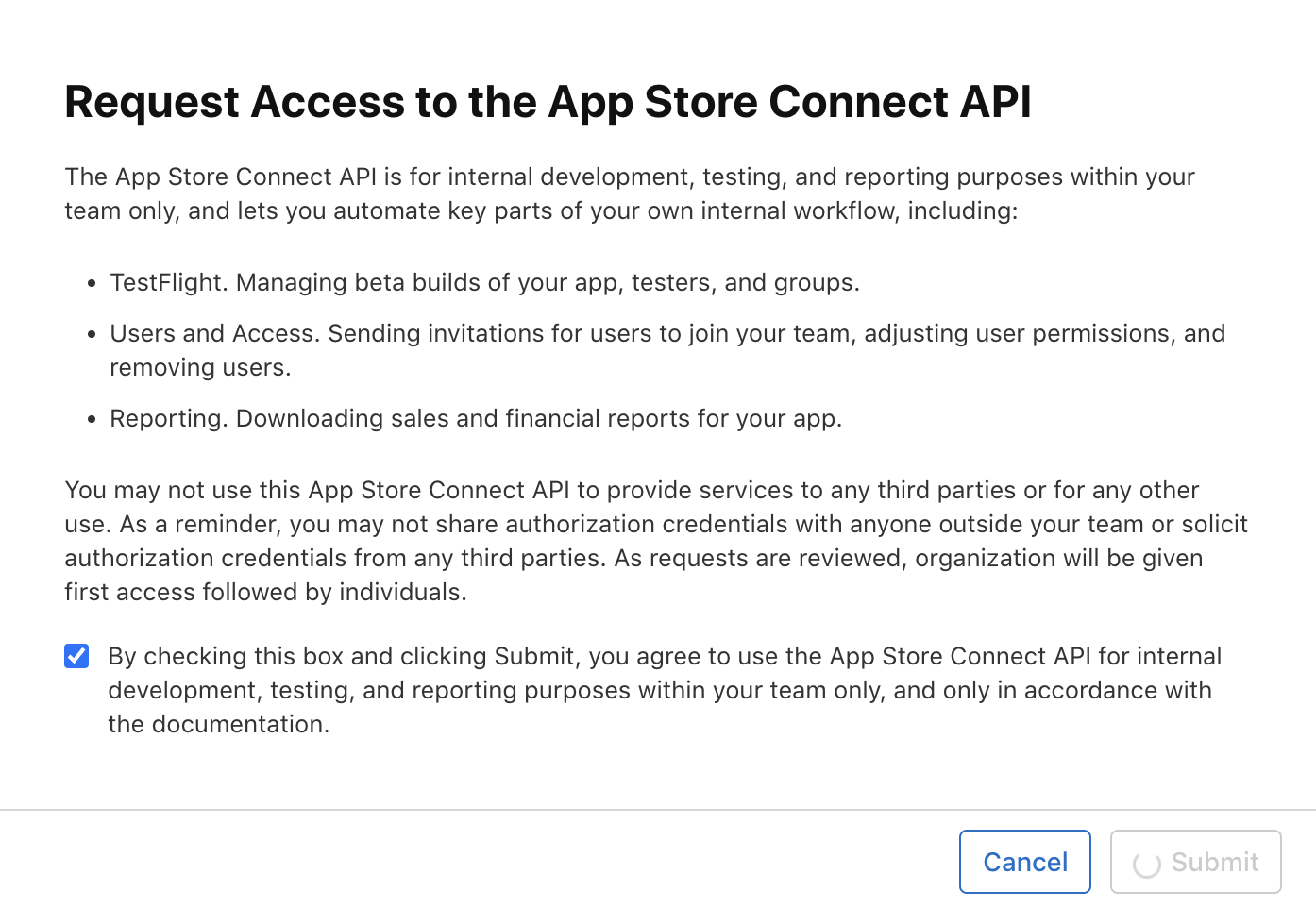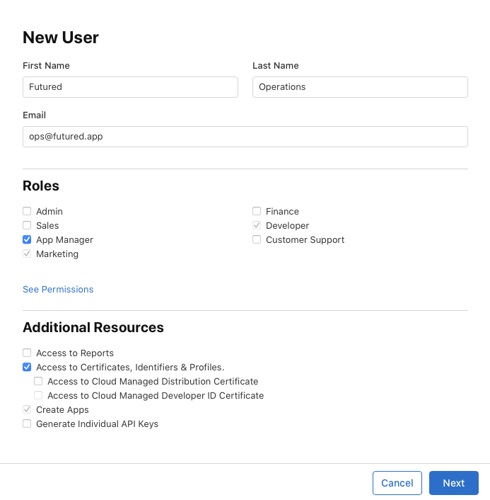 App Manageraccess to be able to maintain app submission. For more information about App Store Connect roles see documentation.We also need access to Certificates, Identifiers & Profiles to be able to properly setup out CI flow via Fastlane. For more information about Fastlane see documentation.