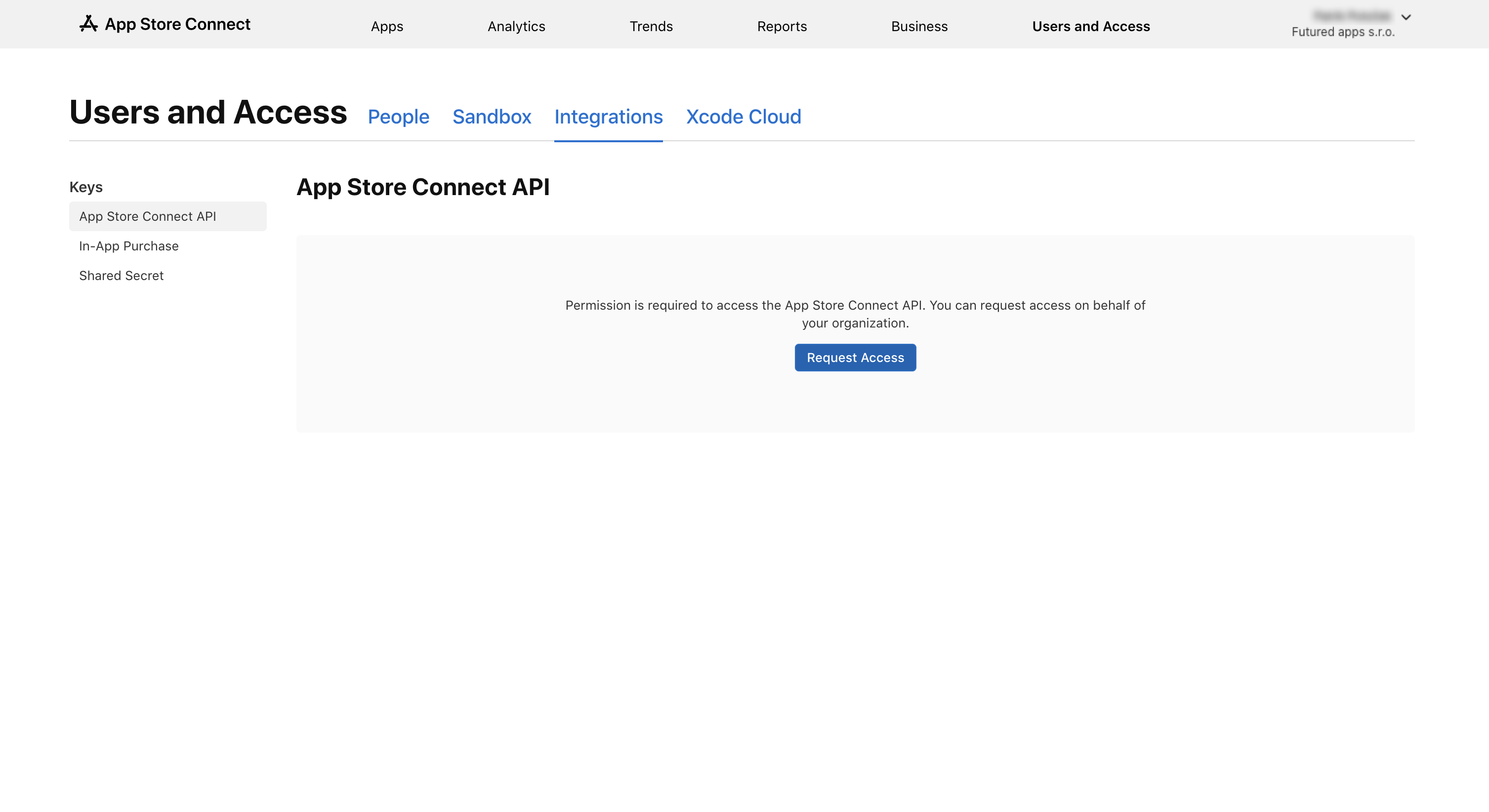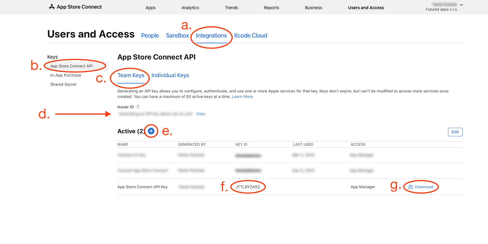 Issuer IDand save it to company's Bitwarden (see for exampleFutured App Store Connect API Keyentry, don't forget to selectiOSandOperationscollections) -