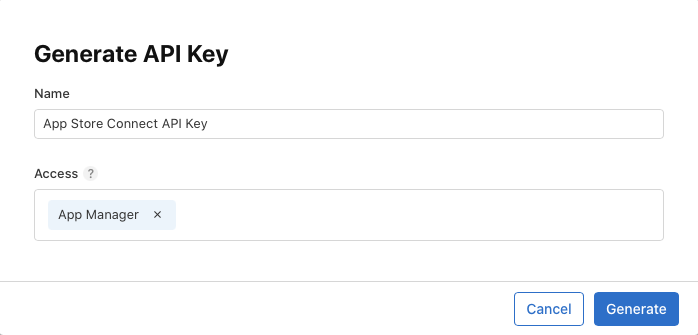 +button, fill key name (there's no naming convention),App Manageraccess role and clickGeneratebuttonAccess