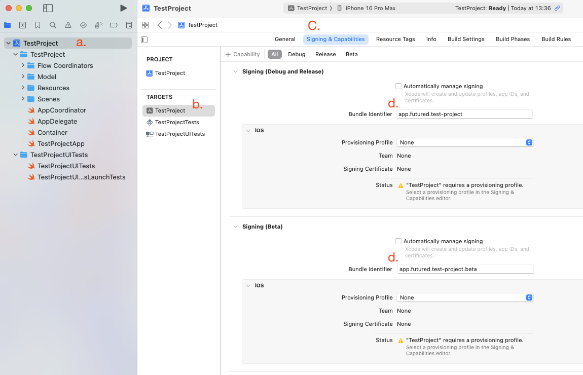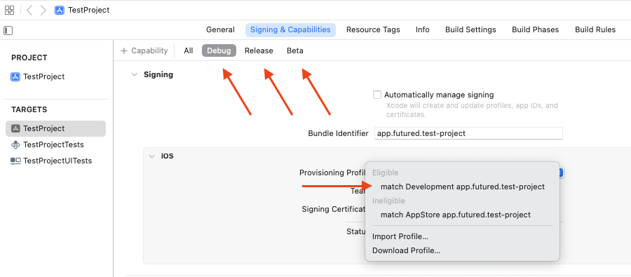 select appropriate provisioning profiles for all configurations in the Target's Signing & Capabilities tab