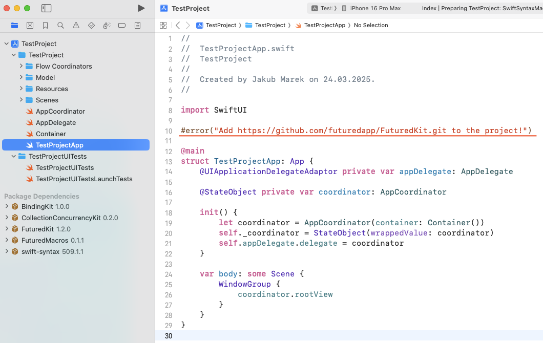 {project_name}App.swiftfile and remove error at line 10#error("Add https://github.com/futuredapp/FuturedKit.git to the project!") -