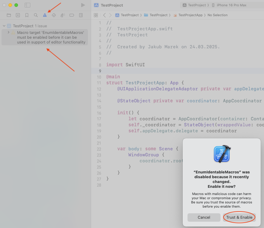 Issue navigator, click theMacro target ...warning and then clickTrust & Enablebutton